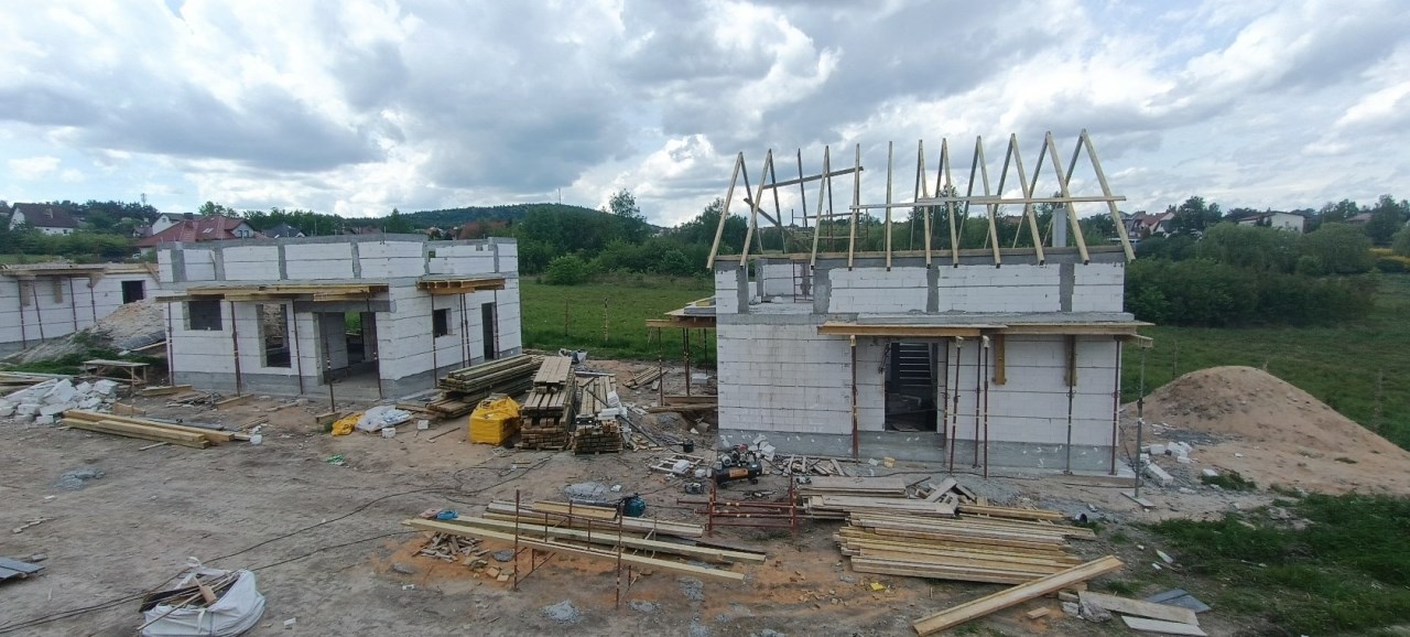 Domy wybudowany w technologi tradycyjnej, murowanej z bloczków betonowych 24cm, ocielone styropianem 18 cm, dach kryty blachą. Ogrzewanie budynków nowoczesną pompą ciepła. Domy przygotowane będą pod montaż instalacji fotowoltaicznej.