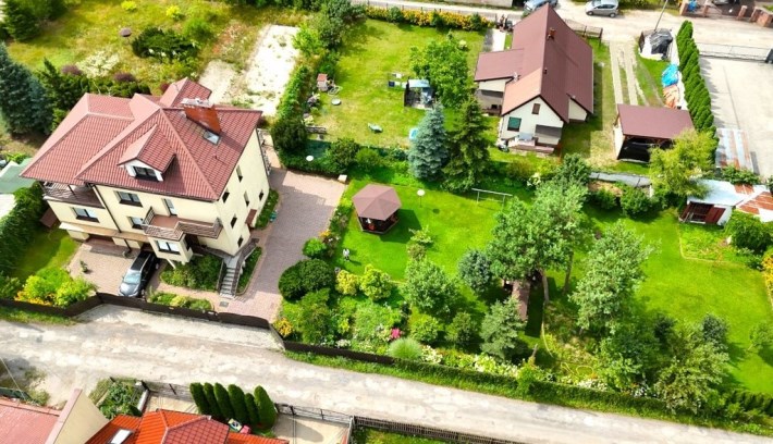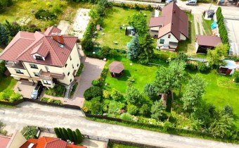 Teren wokół domu zagospodarowany. Na działce znajduje się kostka, trawnik ze zraszaczami do podlegania, krzewami oraz drzewami, altana.