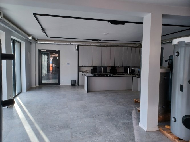 Ogrzewanie w całości podłogowe, zasilane przez nowoczesny piec na pellet.