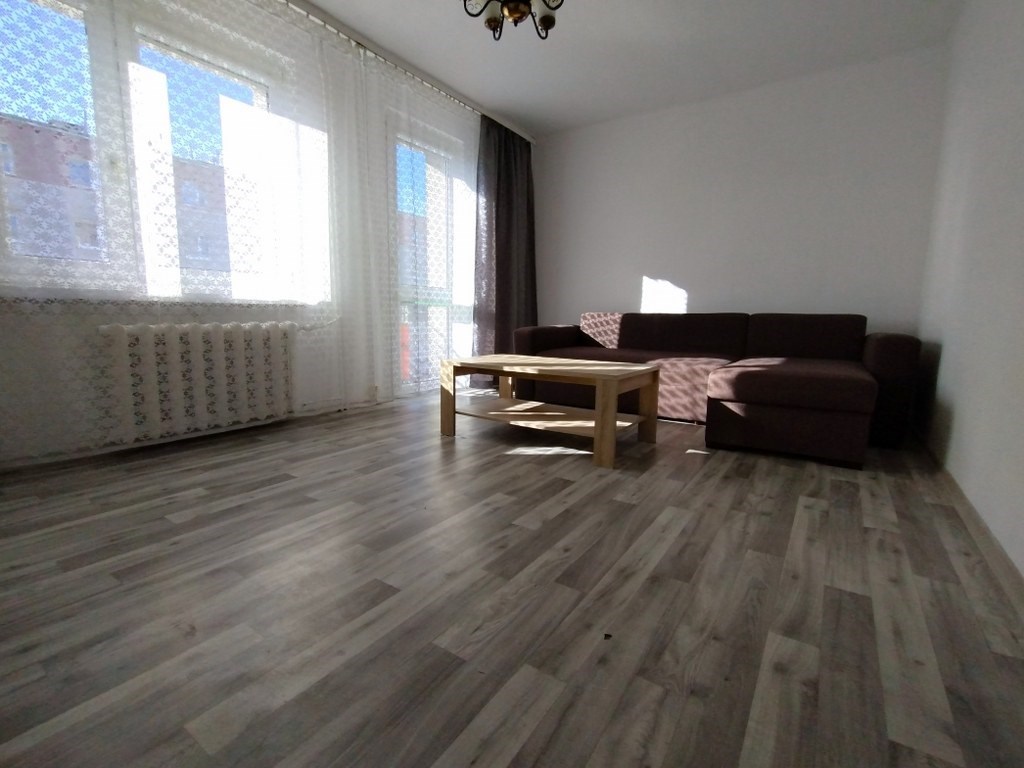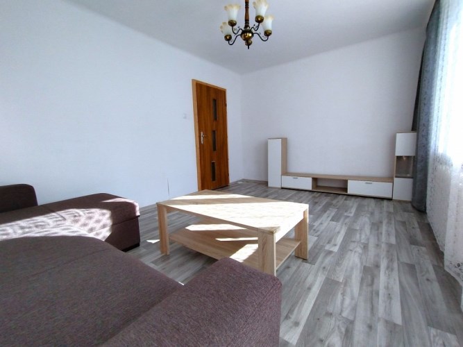 Mieszkanie wyposażone w widoczne na zdjęciach meble, kuchenkę z piekarnikiem, pralkę oraz lodówkę.