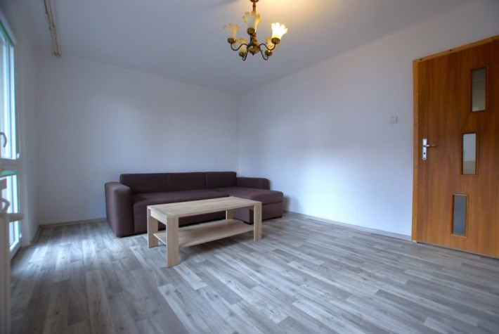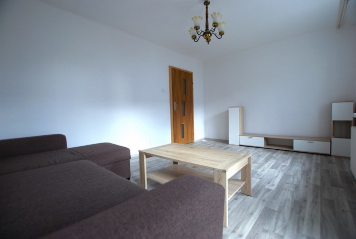 Mieszkanie wyposażone w widoczne na zdjęciach meble, kuchenkę z piekarnikiem, pralkę oraz lodówkę.