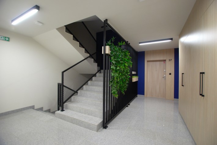Lokal składa się z 2 sypialni (w tym jedna z prywatnym balkonem), dużego przedpokoju z szafą w zabudowie, łazienki razem z WC oraz przestronnego salonu połączonego z aneksem kuchennym z wyjściem na duży balkon.